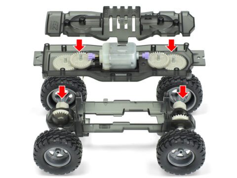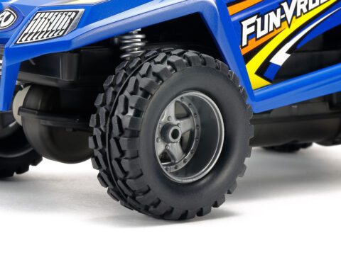 Adesivi metallici sono inclusi nel kit per aggiungere loghi e altri dettagli alla carrozzeria, mentre il telaio EZ ha un motore a doppio albero e non richiede cemento o viti durante il montaggio. Gli pneumatici fuoristrada lo aiutano ad affrontare pendenze ripide.