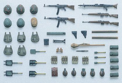 Questo set contiene armi e equipaggiamenti della fanteria tedesca utilizzati durante i periodi di metà e fine della seconda guerra mondiale, riprodotti in scala 1/35.