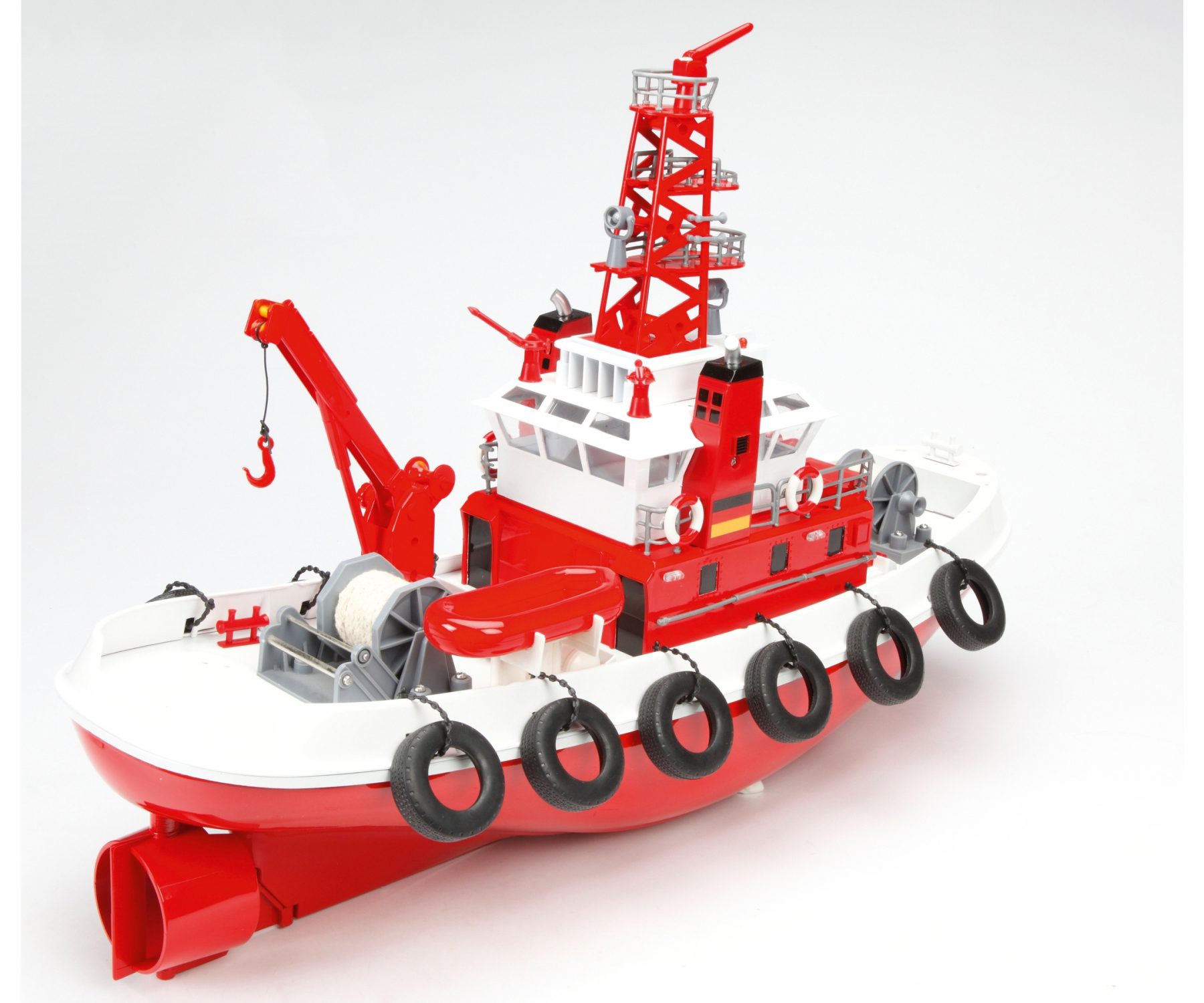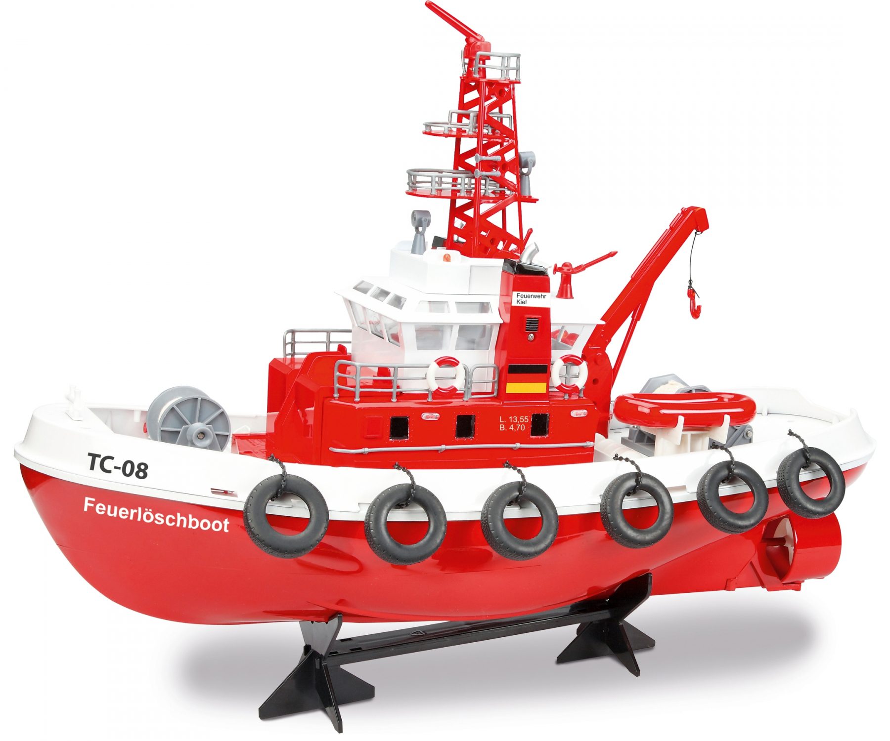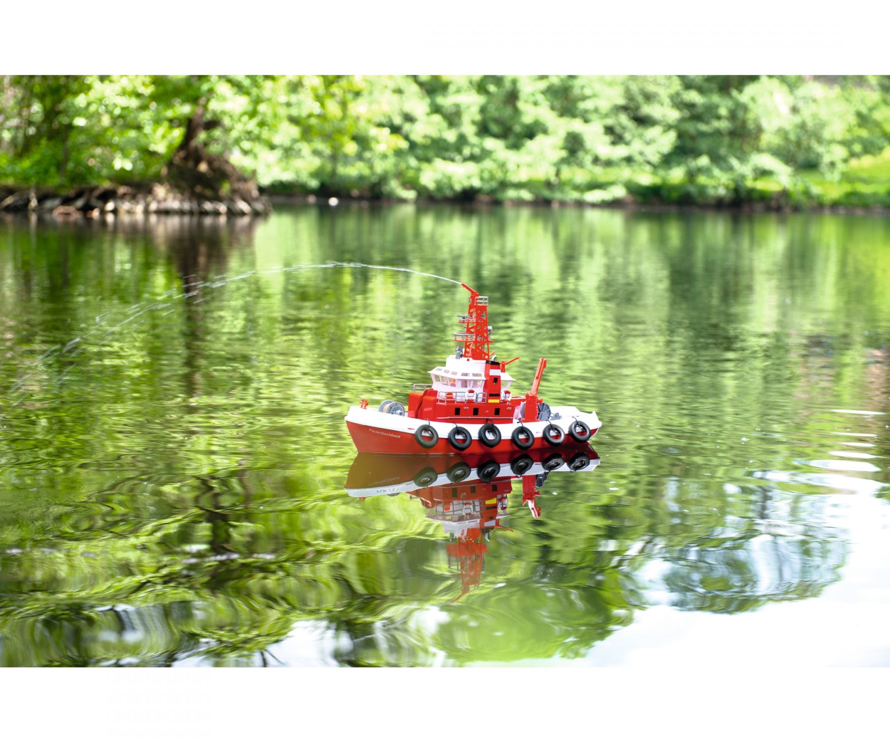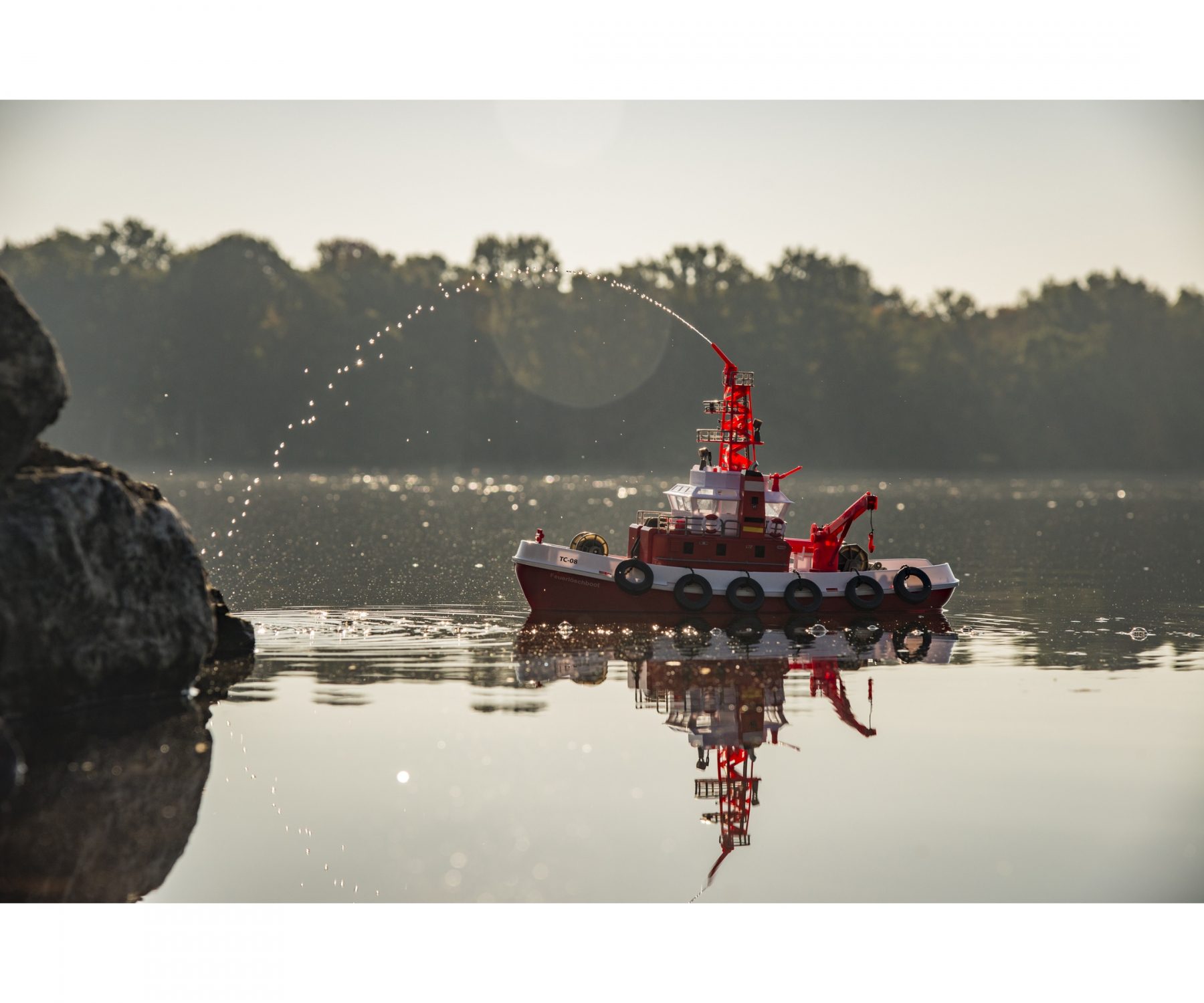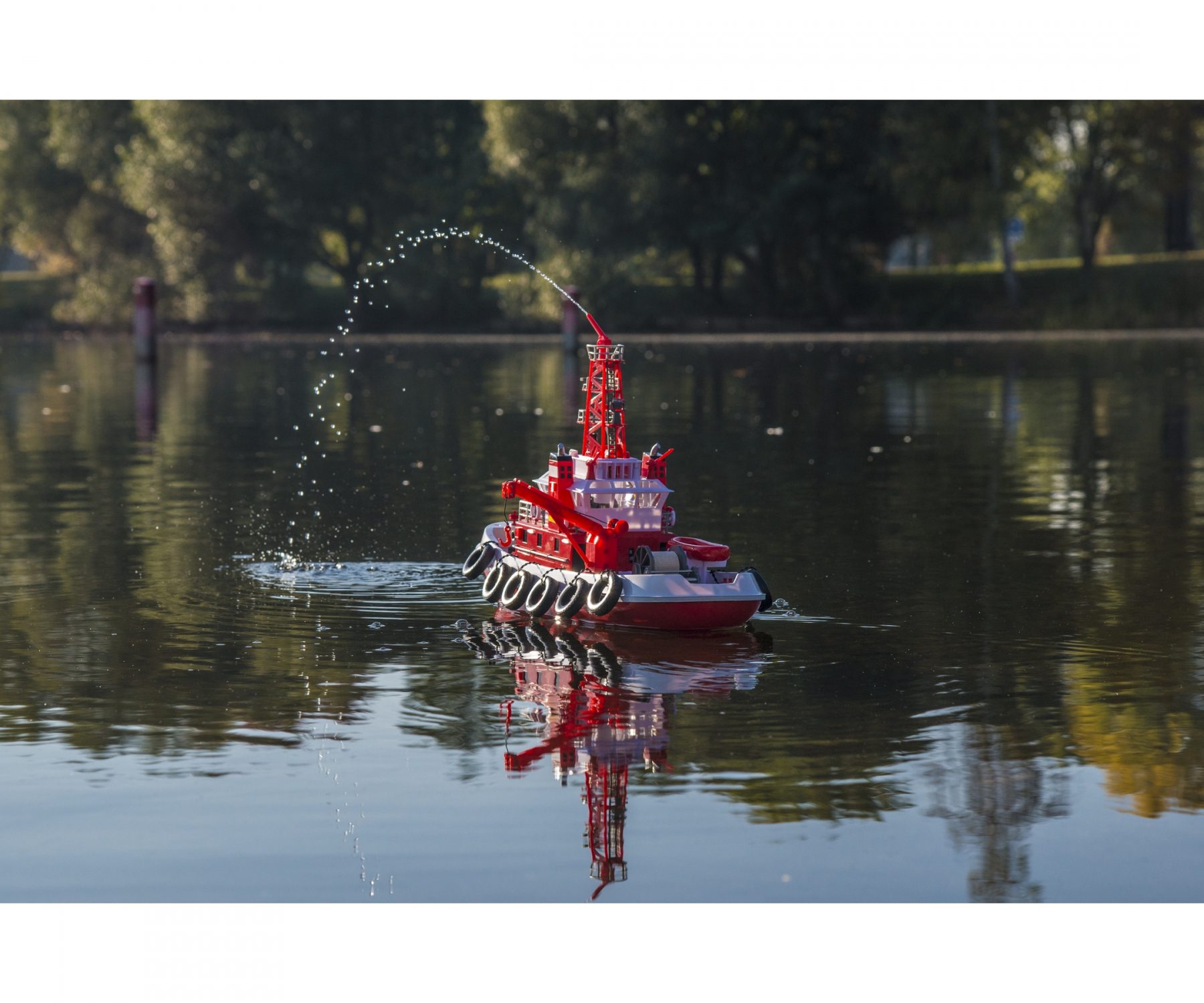 La fantastica barca antincendio CARSON è completamente funzionante e ha persino un vero cannone ad acqua telecomandato. La barca antincendio è fornita di serie con tutto il necessario, incluso il trasmettitore con batterie e una batteria di azionamento con caricabatterie.