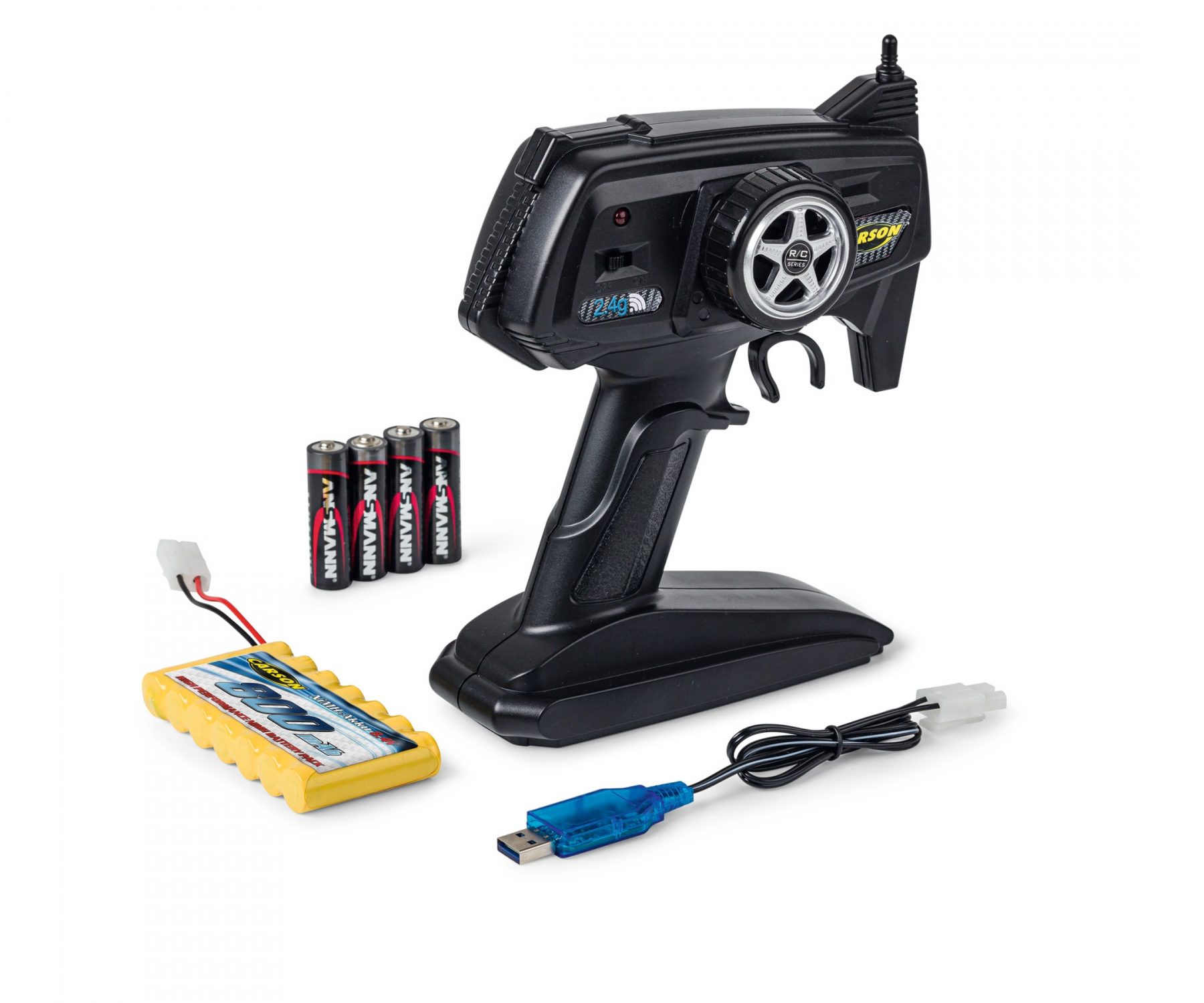 da 8,4 V/800 mAh, caricabatterie USB, 4 batterie AA per il trasmettitore, manuale di istruzioni.