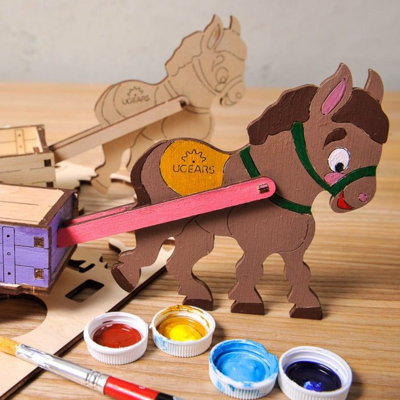 Colora come preferisci: acrilico, tempera, acquerello, pennarelli: puoi usare quello che hai. Puoi colorare il modello da solo, con gli amici o con tutta la famiglia. Delicate linee di contorno sulle parti in legno raffigurano i dettagli dell’asino, le sue lunghe orecchie, gli elementi dell’imbracatura e parti del carro, per renderlo facile da dipingere.