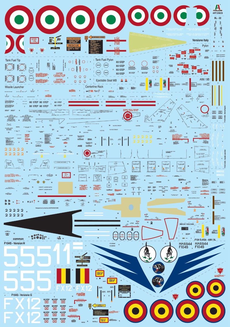 PARTICOLARI DELLE LINEE E DEI RIVETTI FINEMENTE INCISI – MOLTEPLICI DETTAGLI, ABITACOLO E ALLESTIMENTO AVIONICA CON POSSIBILITA’ APERTO/CHIUSO – VANO CANNONE M61 PARTICOLAREGGIATO – AIR BRAKES APERTI O CHIUSI – FOTOINCISO INCLUSO – 316 PEZZI – 2 FOGLI DECAL PER 10 VERSIONI – ISTRUZIONI CON PROFILI A COLORI – (PRM) PHOTOGRAFIC REFERENCE MANUAL