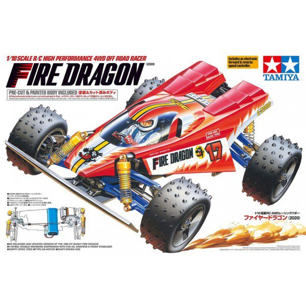 Tamiya FIRE DRAGON era la macchina utilizzata dal personaggio principale della serie manga “Radicon Boy” ed è stato rilasciato per la prima volta come modello R/C nel 1989. Caratterizzato da uno stile unico della carrozzeria e parti del pilotino, questo colorato buggy è un ottimo modo per i principianti di iniziare con questo hobby e per i veterani di R/C per ricordare a se stessi gli anni della loro infanzia. Questa edizione aggiornata di riedizione incorpora alcune parti aggiornate per migliorare la durata. Gode di una trasmissione 4WD di facile manutenzione.