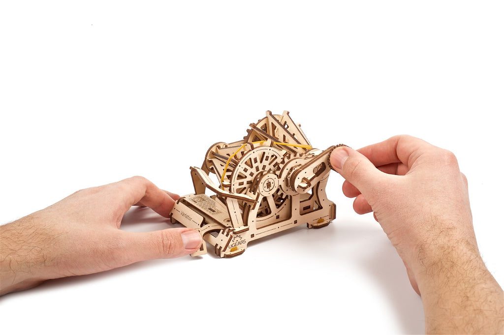 Il variatore della collezione Ugears STEM lab è una replica in legno completamente funzionale di un CVT, cono di attrito azionato da cinghia. Il cono CVT varia il rapporto di trasmissione spostando una ruota o una cinghia su e giù per l’asse del rullo conico. Nel kit modello Ugears Variatore, la cinghia, alimentata manualmente tramite il riduttore, trasferisce la rotazione alle pulegge coniche condotte. Usa la forcella della trasmissione per cambiare marcia e osserva come la velocità della puleggia conica condotta diminuisce o aumenta mentre la velocità della puleggia conica condotta rimane la stessa. Grazie al design aperto del modello, sarai in grado di vedere l’intero processo.